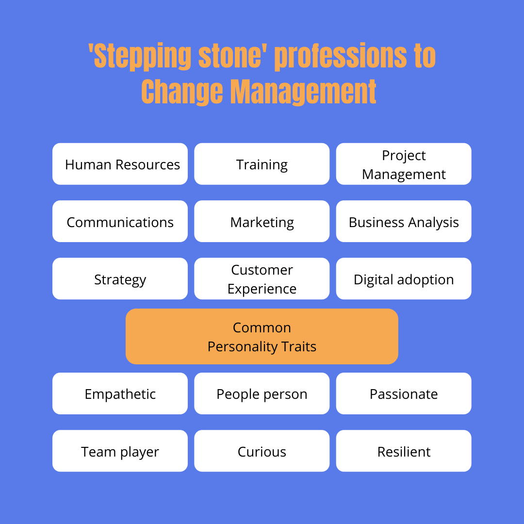 Pathway 1: Complimentary experience and basic skills. There are many 'feeder' jobs that are on the pathway to Change Management. Human Resources, Learning/Training, Project Management, Senior Business Analysis. Yes, all of these are typical pathway disciplines, with many Change Managers having these backgrounds on their resumes. For me, I started in Marketing and Communications. I have experience in Customer experience as well, then moved into projects and then settled into Change once it actually became a well recognised discipline. When I was in an interview many years ago, I had the interviewer mention that my resume read like a 'journey' of skill development and career development. I had never thought of it that way as I just continued to move into challenging roles but it certainly then made me think about next steps more from that point onwards. So if you are considering change as your next step, think about how your experience lends itself to taking that step.